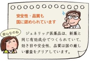 ジェネリック医薬品は、新薬(先発医薬品)と品質は同じですが、値段は安いお薬です。その理由は、新薬の特許が切れた後に販売されるので開発費が少なくて済むからです。みなさんが払うお薬代が減るだけでなく、増え続ける国全体の医療費削減にも貢献でき、健保組合の財政にも効果が期待できます。