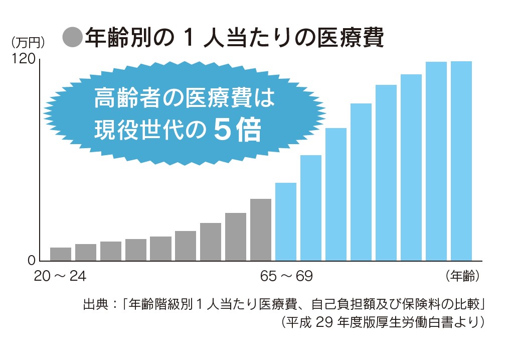 団塊の世代が75 歳以上になり始める令和4年(2022 年)には、現役世代が負担する後期高齢者支援金の急増が見込まれます。団塊の世代が75 歳以上になると5 人に1 人が後期高齢者となるため、世代間で公平な負担となるよう、後期高齢者の窓口負担割合を2 割へと引き上げられます。