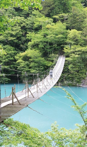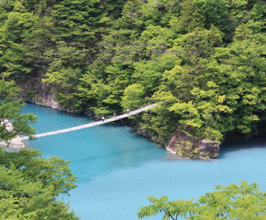エメラルド色の大間ダム湖にかかる吊り橋は、春は新緑に輝き、秋は紅葉の名所として有名だ。