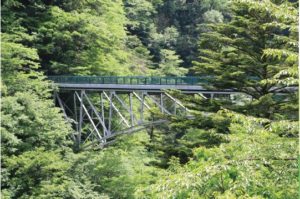 かつて鉄道が走っていた橋で全長 72 m、高さ 約100mのアーチ橋。橋の上からは夢のつり橋、大間ダムを取り囲む寸又峡の絶景を一望にできる。