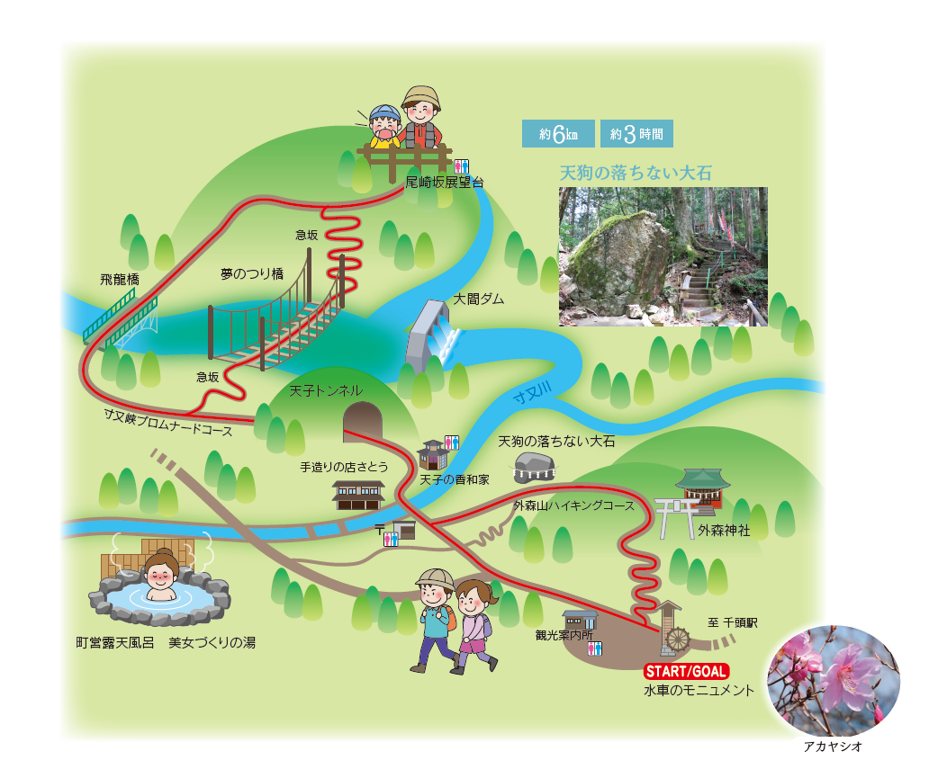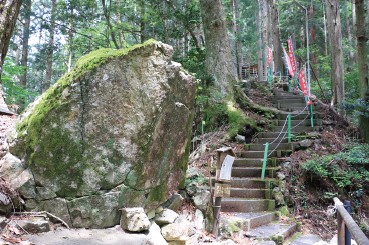 夢のつり橋へ向かう前に外森山ハイキングコースで軽く足ならし。春はアカヤシオの群生が迎えてくれよう。外森神社を過ぎると、落ちそうで落ちない絶妙なバランスで立つ"天狗の落ちない大石"が現れる。受験生や高所で作業する人に人気があるそうだ。