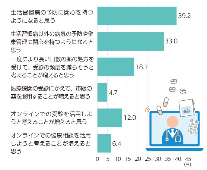それによると、病気や健康に関する意識変化については、「生活習慣病の予防に関心を持つようになると思う」が39.2%、「市販薬の服用が増えると思う」が4.7%、オンラインについては「受診の活用を考えることが増える」が12.0%、「健康相談の活用を考えることが増える」が6.4%などとなっています。新型コロナウイルス感染症を契機に、「生活習慣病予防」への意識や、市販薬を活用するセルフメディケーション、オンラインの利用などへの関心が高まっていることがわかりました。
