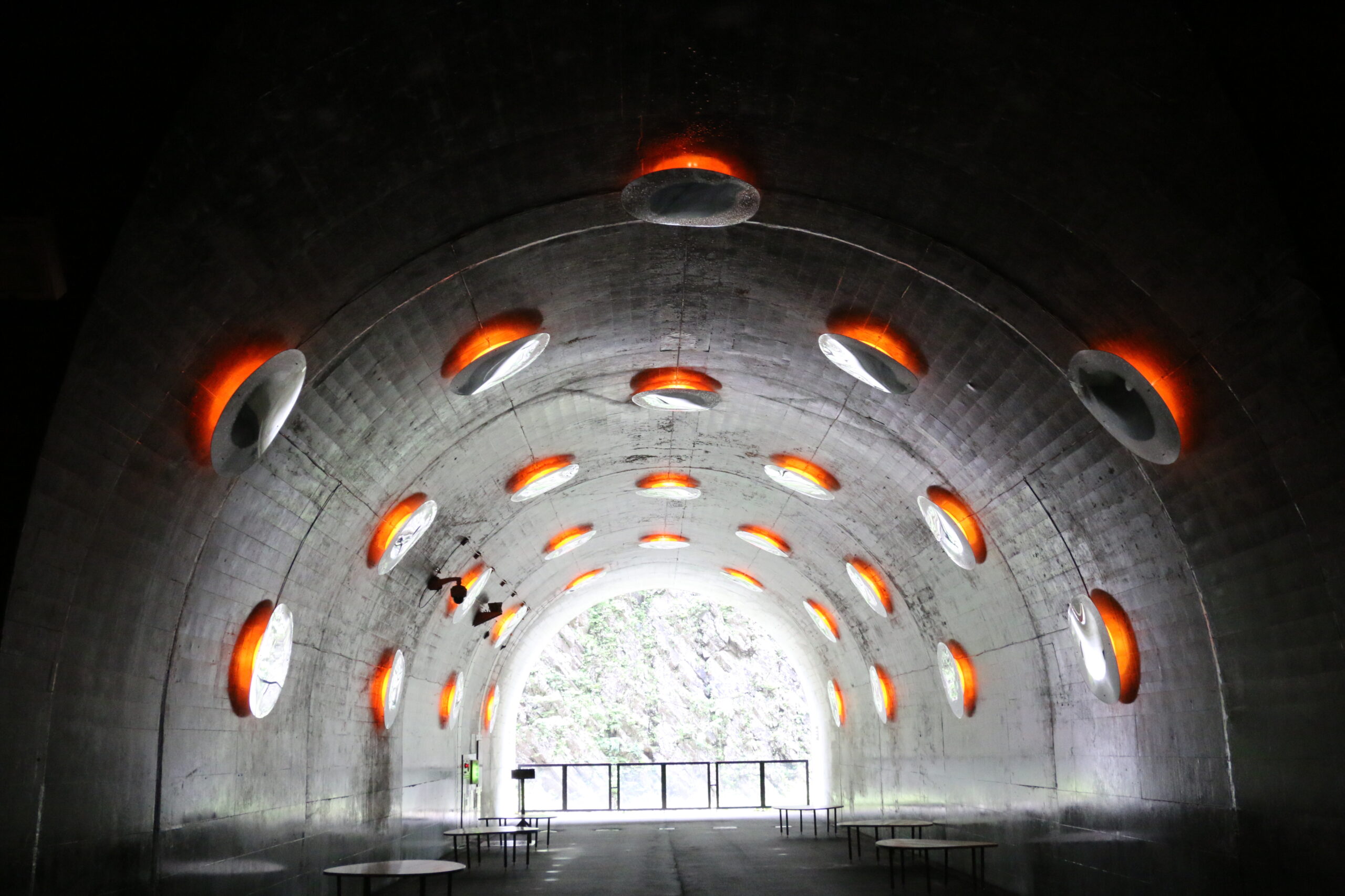 清津峡渓谷トンネルのエントランス施設とトンネル施設は、トンネル全体を潜水艦に見立てた・ヤンソン/ MAD アーキテクツのアート作品「Tunnel of Light」となっている。