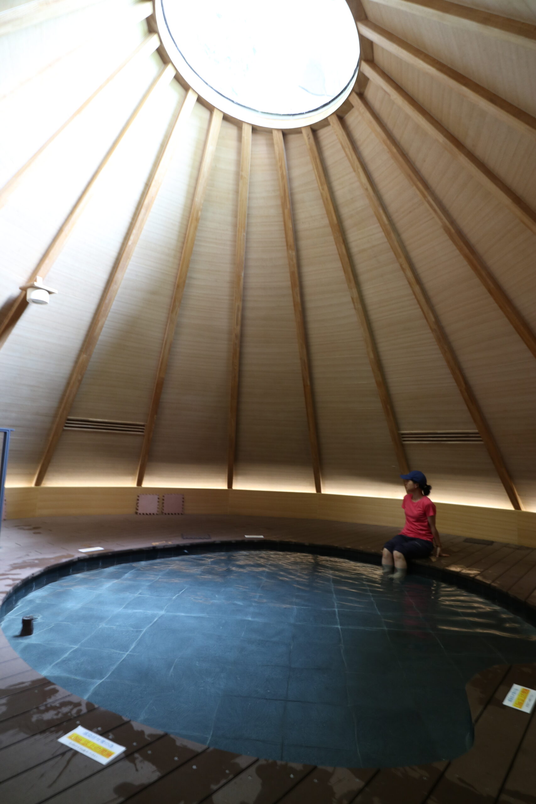 折り返してトンネル内を戻ろう。エントランス施設には、円錐形の屋根が印象的な足湯がある。一度リフレッシュしてから、ゴールをめざすのもよいだろう。