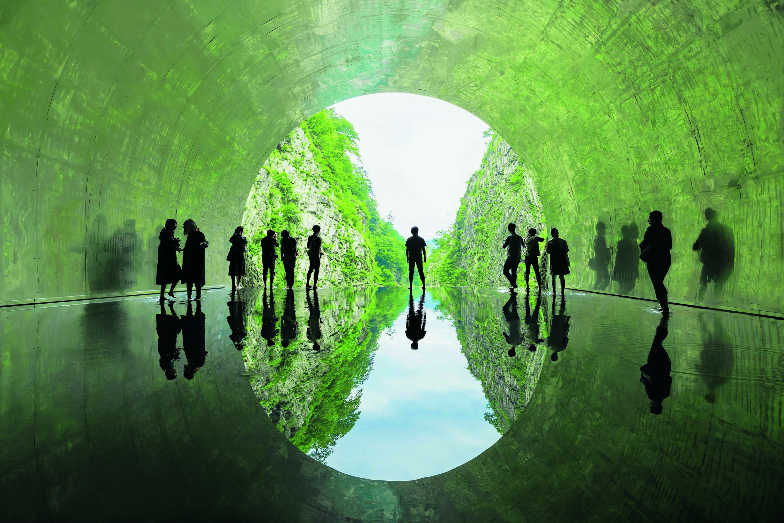 トンネルの終着地点はパノラマステーション。足元に浅く水が張られた「水盤鏡」に、外の風景が反転して映し出される幻想的な眺めは、圧巻だ。