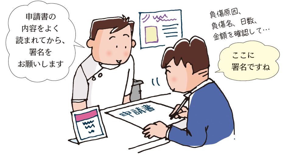 柔道整復師に健康保険でかかった場合、患者は窓口で自己負担分のみを支払い、柔道整復師に健保組合への請求を委任する「受領委任払い」が認められています。受領委任払いでは、「療養費支給申請書」の内容を確認し、自分で署名する必要があります。必ず、負傷原因、負傷名、日数、金額をよく確認し、自筆で署名をしてください。