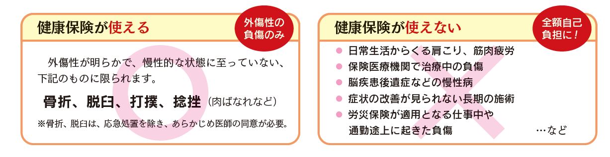 近年、整骨院・接骨院の数が増え、多くの人が気軽に利用できるようになっています。なかには、どんな施術でも健康保険証が使えると勘違いしている人もいるようですが、健康保険証が使えるのはごく限られたケースです。施術を受ける方もルールを知って、守ることが大切です。