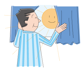 人の体内時計は24 時間より少し長めですが、起床直後の太陽の光でリセットされます。体内時計がリセットされてから15~16時間後に眠気が現れるので起床後なるべく早く太陽の光を浴びましょう。