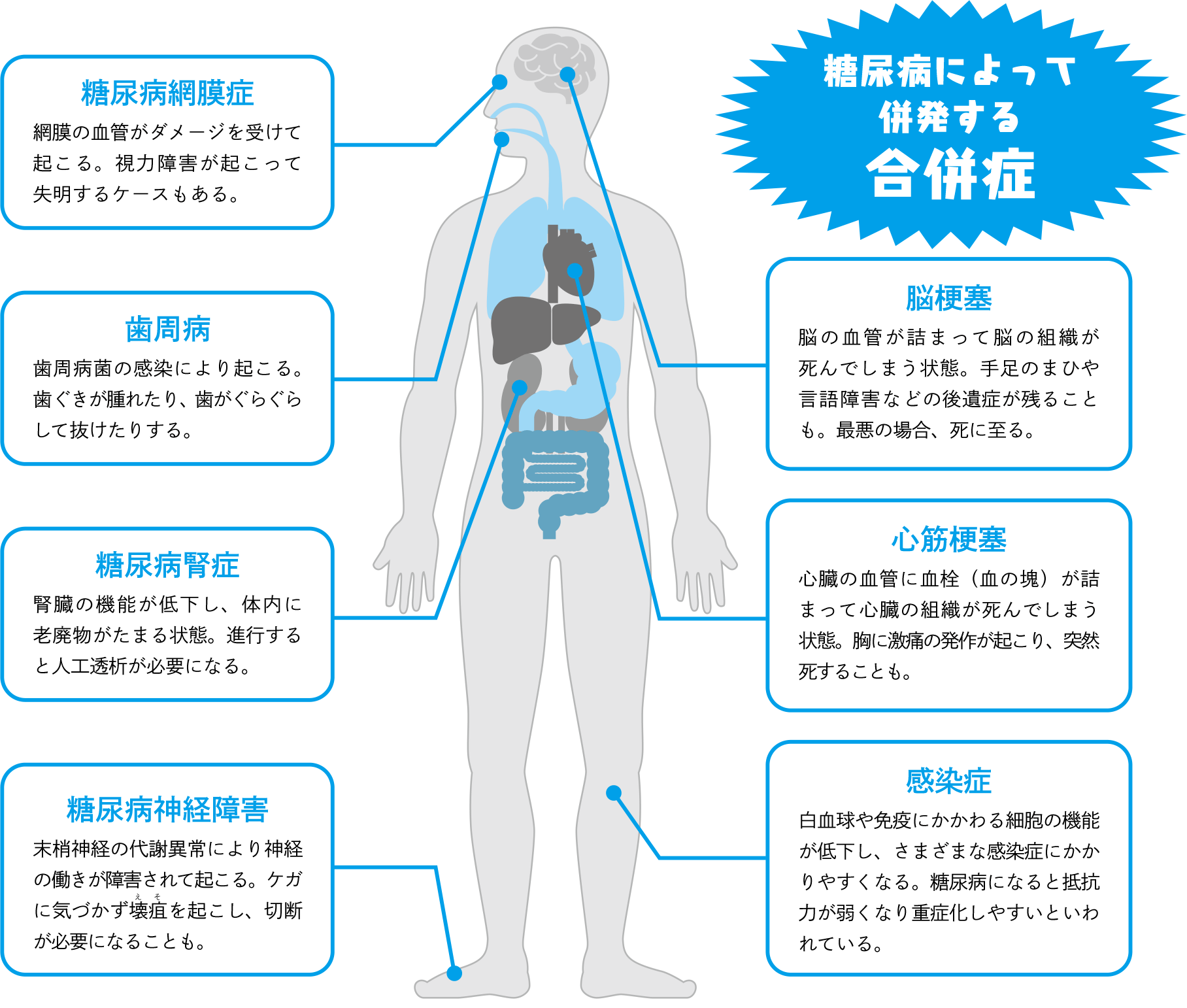 高血糖(血液中のブドウ糖が多い状態)が続くと、全身の血管に障害が起こります。糖尿病になり重症化すると、失明や腎不全などの合併症、さらには心筋梗塞や脳梗塞など命に関わる病気を発症します。