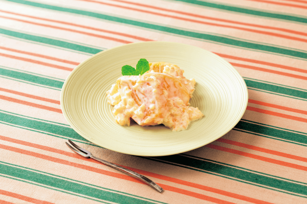- 2.にくし切りの柿を加え、さっと混ぜ合わせて器に盛り、お好みでミントを飾る。