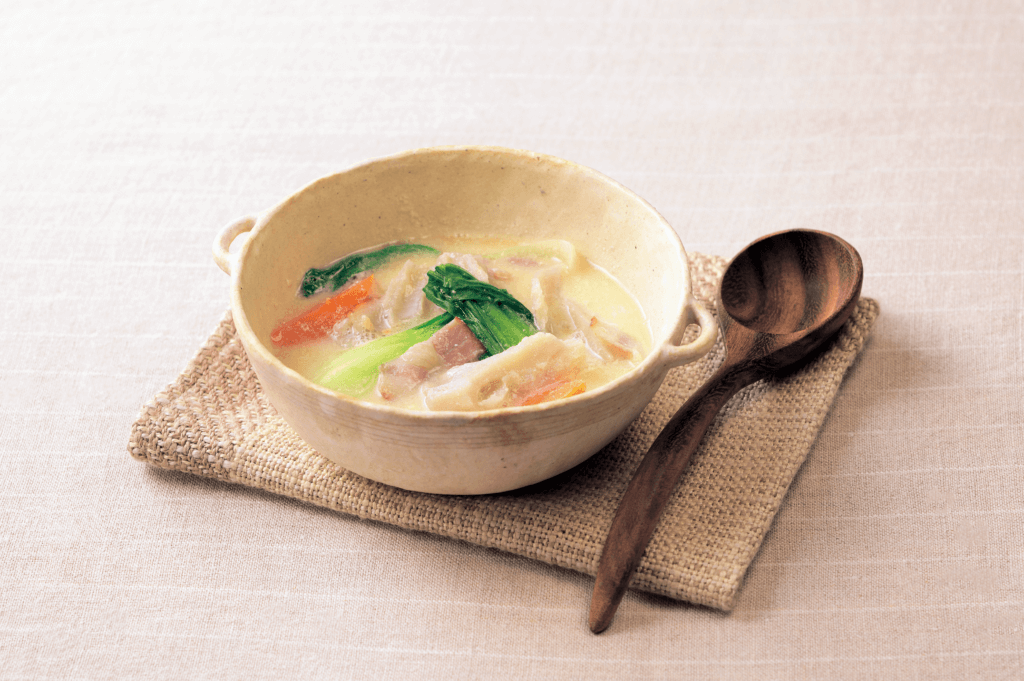- 鍋に水、れんこん、にんじん、ベーコンを入れて火にかける。れんこんに火がとおったら豆乳、チンゲン菜、みそを加え弱火で2 ~ 3 分加熱する。