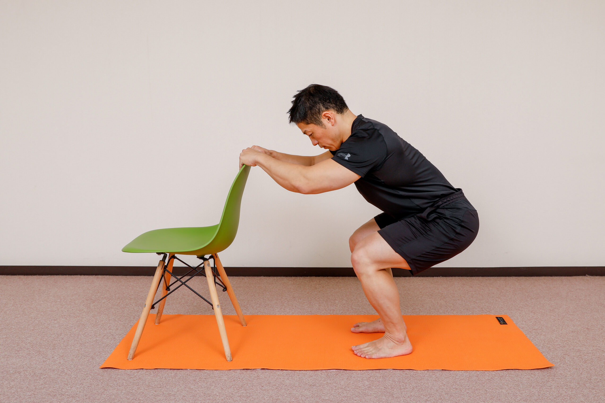 スクワットのしゃがんだ姿勢から斜め前方に足首、膝、股関節を伸ばしていきます。