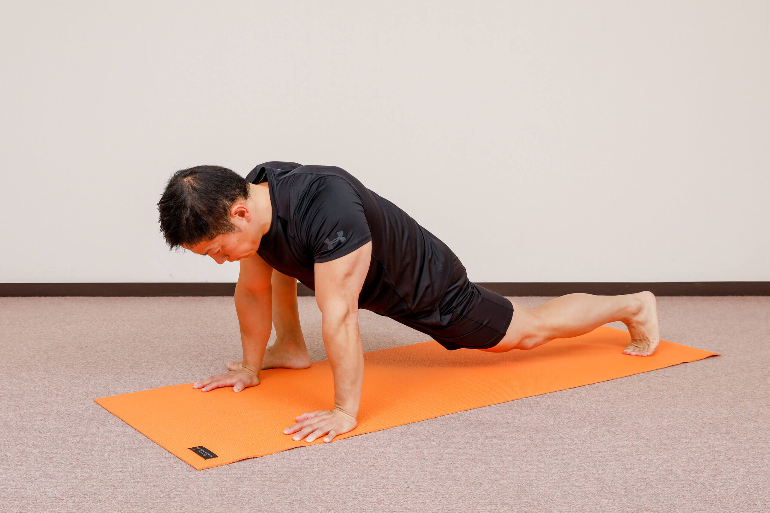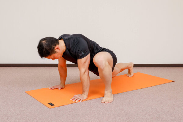 腕立て伏せの姿勢で、左右の脚を交互に前に出します。