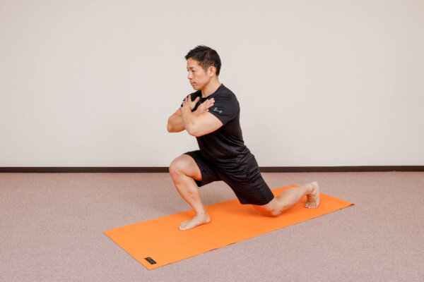 片方の脚をなるべく遠くの後方につき、腰を落とします。左右交互に繰り返します。