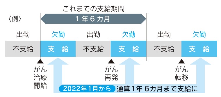 傷病手当金の支給期間は、支給開始日から起算して1年6カ月を超えない期間とされますが、がん治療で長期間にわたり休暇をとりながら働くケースなど、治療と仕事の両立を支えるために、働いた期間を除いて1 年6 カ月を通算できるようになります。