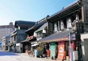 蔵造りや大正時代に建てられた店舗、昭和時代の洋風建築などが軒を連ねる商店街。