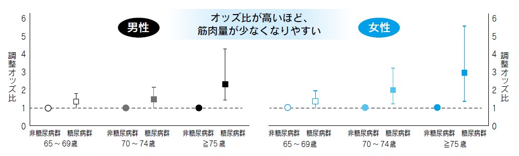 高齢者(65 歳以上)6,133人の健診データの分析によると、糖尿病群と非糖尿病群において筋肉量の代替指標となる血清クレアチニン値を比較した際、糖尿病群は非糖尿病群より低い血清クレアチニン値(筋肉量が少ない)がみられました。また、早期、中期、後期の高齢者では、どの年齢群でも糖尿病群で非糖尿病群より有意に低血清クレアチニン値になる確率が高いことが示され、後期高齢者でその傾向がよりみられました。