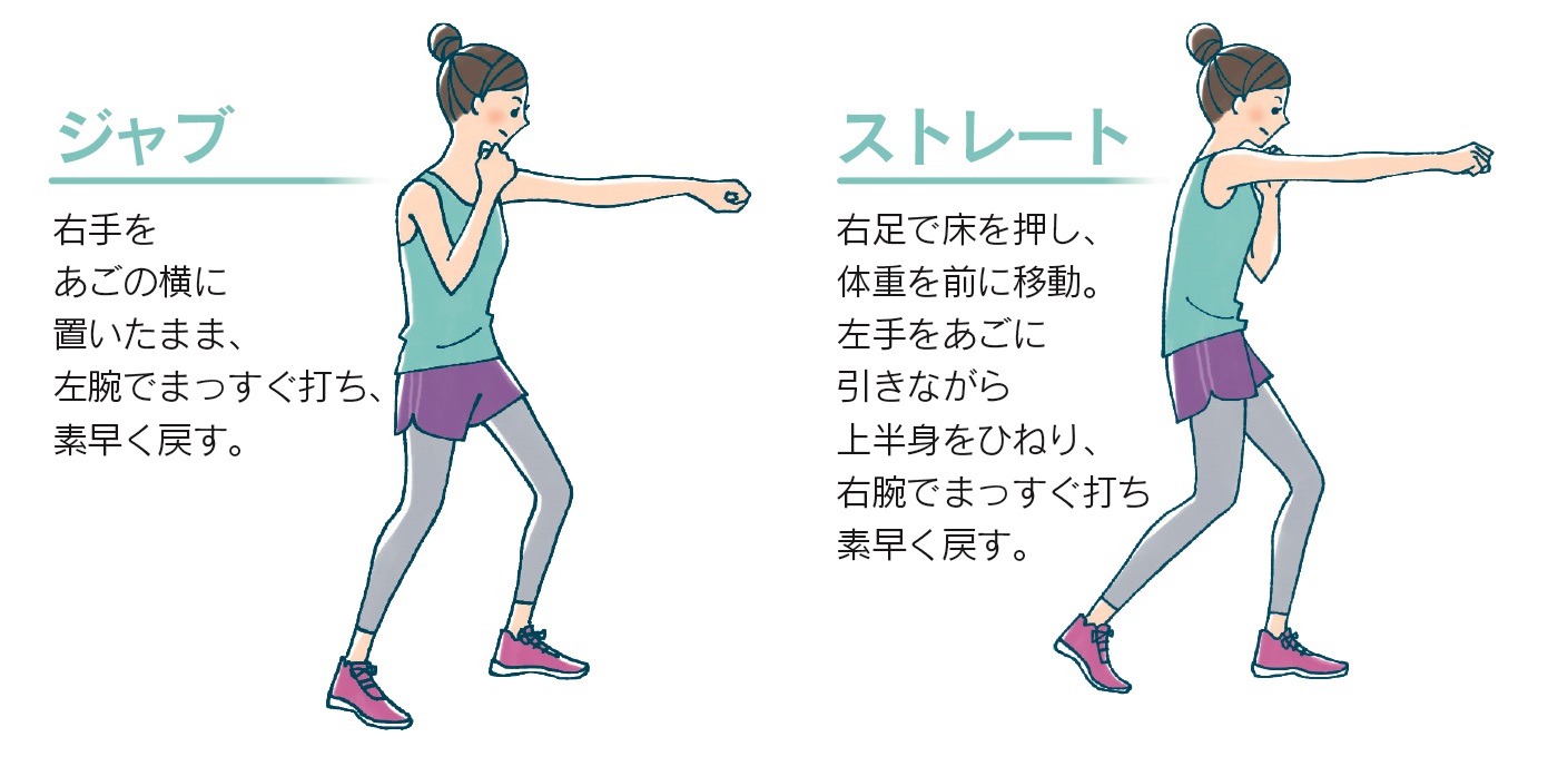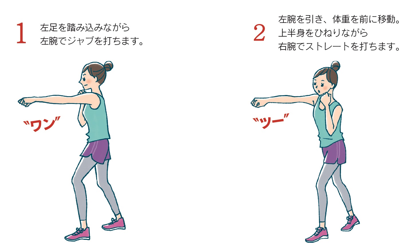前後に体重を移動させながらステップを踏み、ワン・ツーのリズムに合わせてジャブとストレートを打つ動きです。